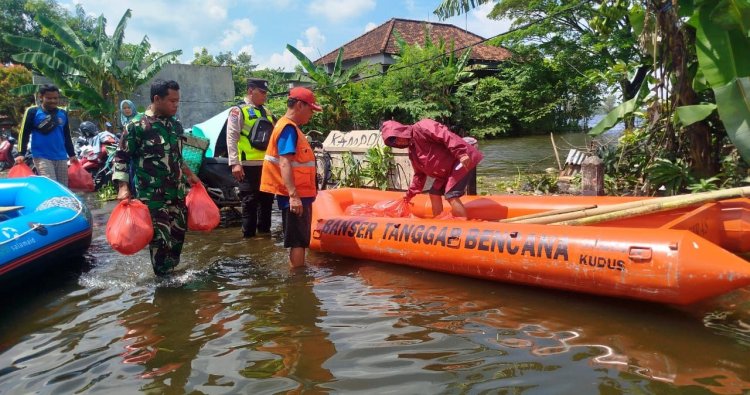 KUDUS – Babinsa Karang Rowodan Bhabinkamtibmas bersama Tim Desa Tangguh Bencana (Destana) Karangrowo melaksanakan kegiatan pendistribusian makanan bagi warga yang terdampak bencana banjir di Dukuh Krajan Desa Karangrowo Kecamatan Undaan Kabupaten Kudus. Selasa (19/01).